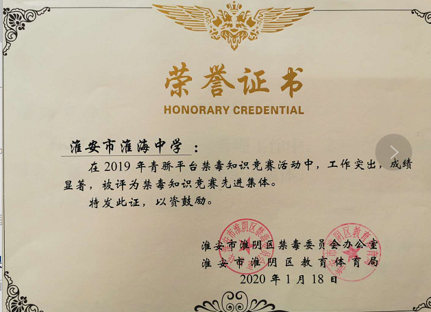 淮海中(zhōng)學喜獲淮陰區2019年度 “安全工(間們gōng)作先進集體(tǐ)”和“禁毒知(zhī)識競賽先進集體(tǐ)機了”