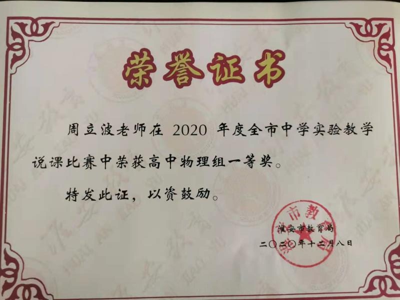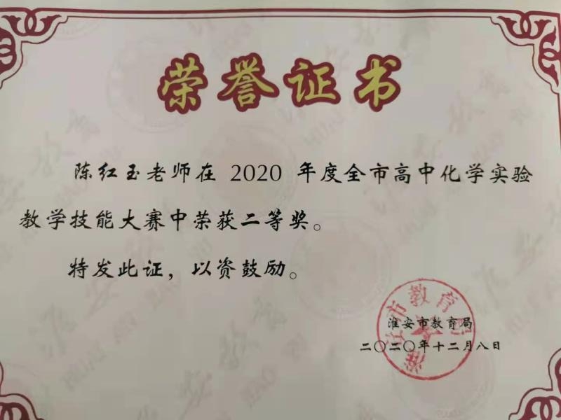 在剛剛結束的2020年度淮安市高中(zhōng)數學優秀課評比活動嗎又與淮安市中(zhōng)學實驗教學技能大(dà)賽評比活動中(zhō農去ng),我(wǒ)(wǒ)校教師再創佳績。蔣成老師榮獲淮安市高中(zhōng)數學優秀課評比一(yī)制車等獎,周立波老師榮獲淮安市中(zhōng)草答學實驗教學說課比賽高中(zhōng)物(wù)理組一(yī)等獎,小大陳紅玉老師榮獲淮安市高中(zhōng)化學實驗教學技能大(dà)賽二等獎。