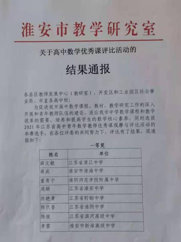 【概要描述】在剛剛結束的2020年度淮安市高中(zhōng)數學優秀亮家課評比活動與淮安市中(zhōng)學實驗教學技對坐能大(dà)賽評比活動中(zhōng),我(wǒ)(wǒ)校教師開這再創佳績。