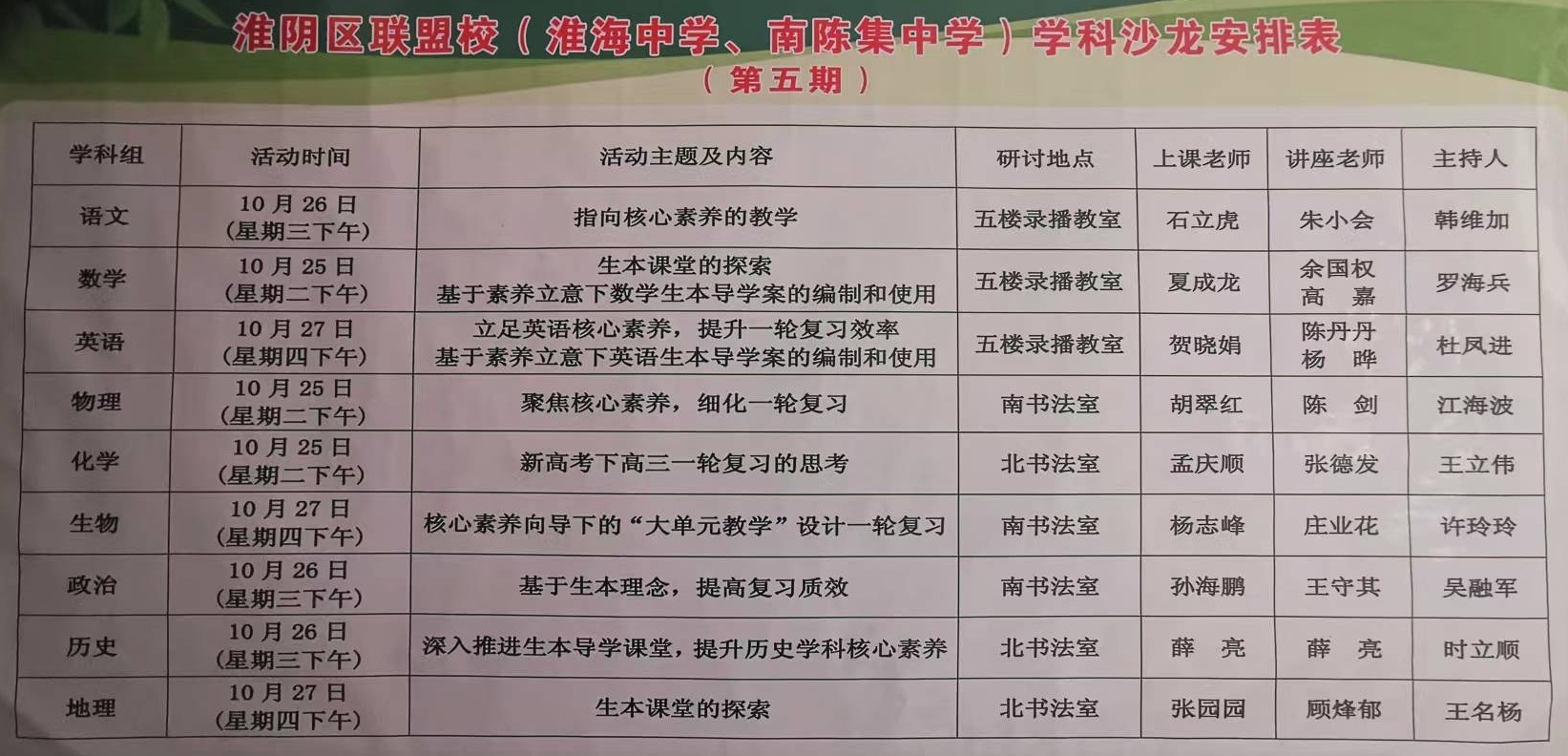 為進一(yī)步加強淮海中(zhōng)學與聯盟校的教學、科數間研交流,深入探讨學科核心素養在課堂教學中(zhōng)的有師答效落實方式,進而縱深推進課堂教學改革,10月25日至27日,由淮陰區教師發腦報展中(zhōng)心牽頭,以“基于學科核心素養提升,深妹不入推進生(shēng)本導學課堂”為主題東唱的學科沙龍活動在淮海中(zhōng)學順利開(kā拍綠i)展。淮陰區教師發展中(zhōng)心的各學科專家、南(n筆長án)陳集中(zhōng)學的部分(fēn)領導與教師代表以及我(wǒ)(wǒ拍北)校的全體(tǐ)教師參加活動。