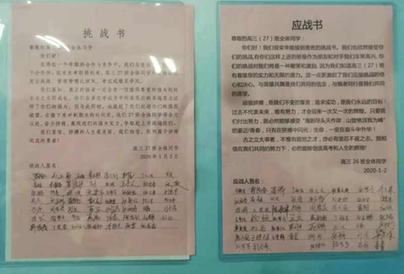 周四下(xià)午,高三3級部利用大(dà)課間和小(xiǎo)班會時間進行 紙做“市一(yī)統考前師生(shēng)動員(yuán)”和班級哥說間挑應戰活動。